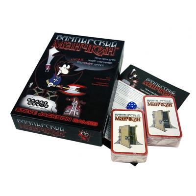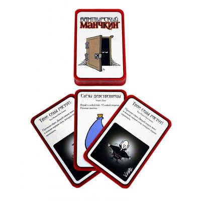 «Вампирский манчкин» — сверхъестественно готическое развлечение! Мрачная палитра игры состоит из оттенков красного и чёрного, главные герои — упыри, волколаки и подменыши, и лучше тебе не знать, сон чьего разума породил местных чудовищ. Готовься к битве! Точи серебряные ножики, тащи плащи, причёску поправь, тени помрачнее наведи, и вперёд — развоплощать баньши, усмирять адских гончих и выпускать настоящую кровь из выхухолака. Разрази всех гроб! Достигни 10-го уровня первым!